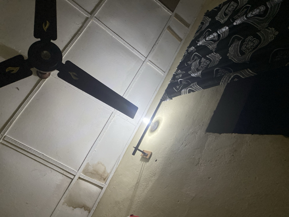 The image depicts an interior room in Dabawa, Nigeria, viewed from a low angle looking upwards. A white paneled ceiling shows multiple areas of brown water staining. A dark, three-bladed ceiling fan, adorned with light-colored patterns on its blades, is visible in the upper right, partially cropped. Below the ceiling, a light-colored wall with a textured surface features a horizontally mounted dark rod. A bright, circular light source is affixed to this rod, which is secured to the wall by a small wooden bracket on the left. A dark-colored curtain, featuring a repetitive light-colored pattern, hangs in the lower right, partially obscuring a dark rectangular opening. No individuals are present.