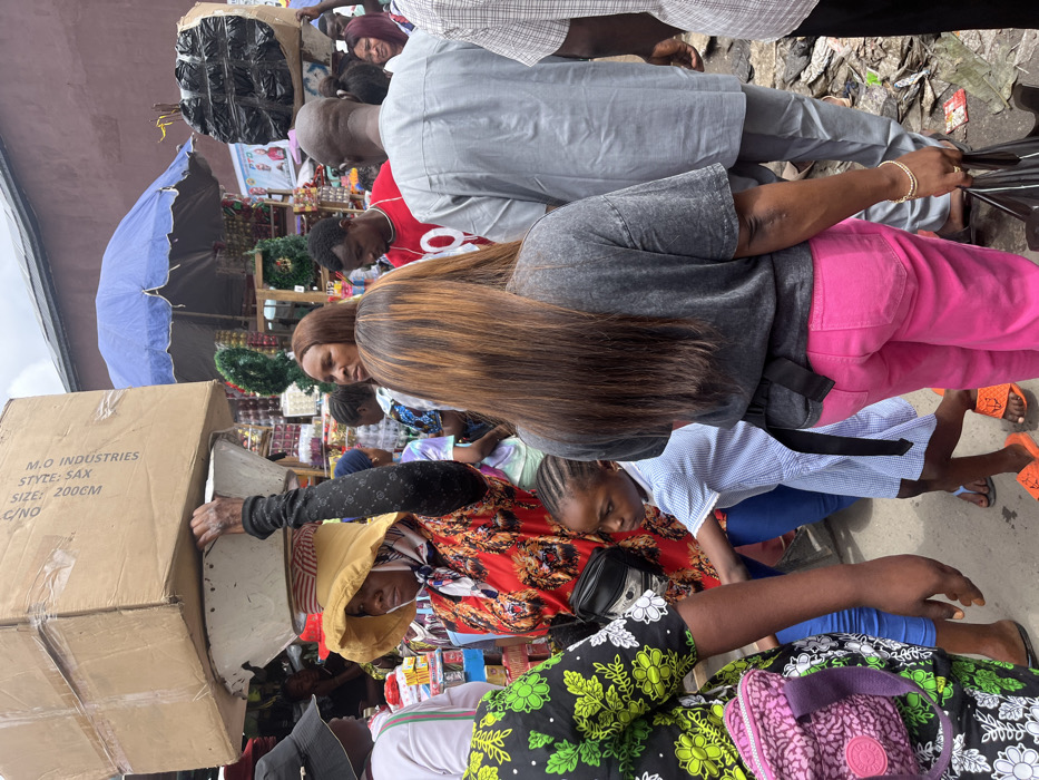 The image depicts a crowded, open-air market street in Lagos, Nigeria, under an overcast sky. The ground is uneven, appearing to be a mix of dirt and concrete, with visible debris. In the mid-ground, a woman with a wide-brimmed yellow hat over a patterned headscarf and a red, black, and orange patterned top carries a large, plain cardboard box on her head, balanced on a white basin. Her left arm is raised, hand touching the basin for stability. She wears a black long-sleeved garment under her top. Adjacent to her and slightly forward, a young girl, approximately 6-8 years old, wearing a light blue and white striped dress and orange slip-on sandals, walks with her left arm slightly extended. In the immediate foreground on the right, the back of a woman with long, straight brown hair with blonde highlights is visible. She wears a grey t-shirt, bright pink trousers, and carries a black shopping bag in her right hand, while a gold-colored bracelet adorns her left wrist. Behind her, a man is seen from the back, wearing a light grey traditional Nigerian tunic and trousers. On the far left, a person wearing a black bucket hat and a green, black, and white floral patterned top, with a pink patterned fanny pack, is partially visible. In the background, numerous other individuals move through the market. A blue market umbrella shades a stall displaying various goods, including what appear to be green wreaths and red ornaments, suggesting items for sale. Another person in the far background carries a black, irregularly shaped object wrapped in plastic on their head. Some of the visible packaging on the box being carried reads "M.O. INDUSTRIES," "STYLE: SAX," and "SIZE: 200CM."