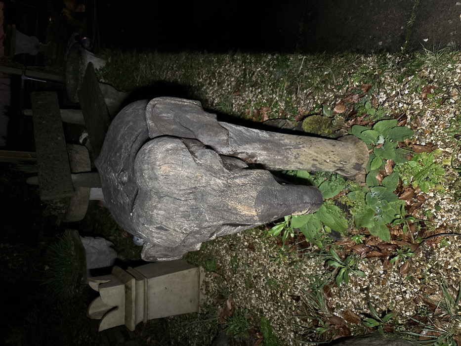 - "The scene, located in Shrewsbury, United Kingdom, displays a weathered, dark grey-brown carved wooden elephant statue situated outdoors on a gravel-covered surface" by FM-RPcgE2, licensed under CC BY 4.0