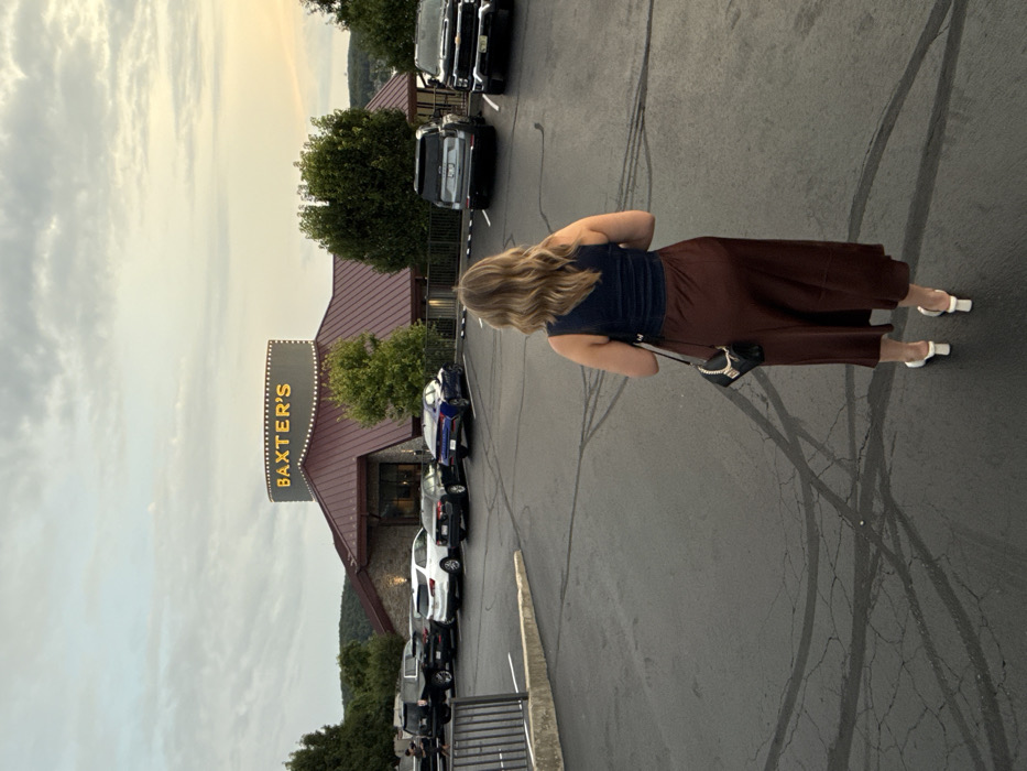 The image displays an outdoor scene at dusk or under overcast conditions, centered on the parking lot and building of Baxter's Lakeside Grille, located at 1232 Jeffries Road, Lake Ozark, Missouri, United States. In the immediate foreground, a female individual is observed from behind, walking across the asphalt parking lot. She has shoulder-length, wavy, light brown hair and is wearing a dark blue sleeveless top, a long, dark brown skirt, and white open-back, low-heeled shoes. A small black shoulder bag with a gold chain strap is slung over her left shoulder. The mid-ground is dominated by the restaurant building, "Baxter's," which features a maroon metal roof and stone-clad sections. A prominent circular sign on the building's facade displays "BAXTER'S" in illuminated yellow letters with a surrounding border of lights. Several vehicles are parked in the asphalt lot, including a dark pickup truck, a white SUV, a dark sedan, a blue sedan, a light grey SUV, and another dark pickup truck. The asphalt exhibits visible cracks and tire marks. Green trees and bushes are situated around the building and along the parking area's perimeter. In the background, forested hills are visible, with a body of water, consistent with Lake Ozark, faintly discernible on the right horizon. The sky above is overcast with shades of grey and muted yellow. No direct interactions between individuals are observed.