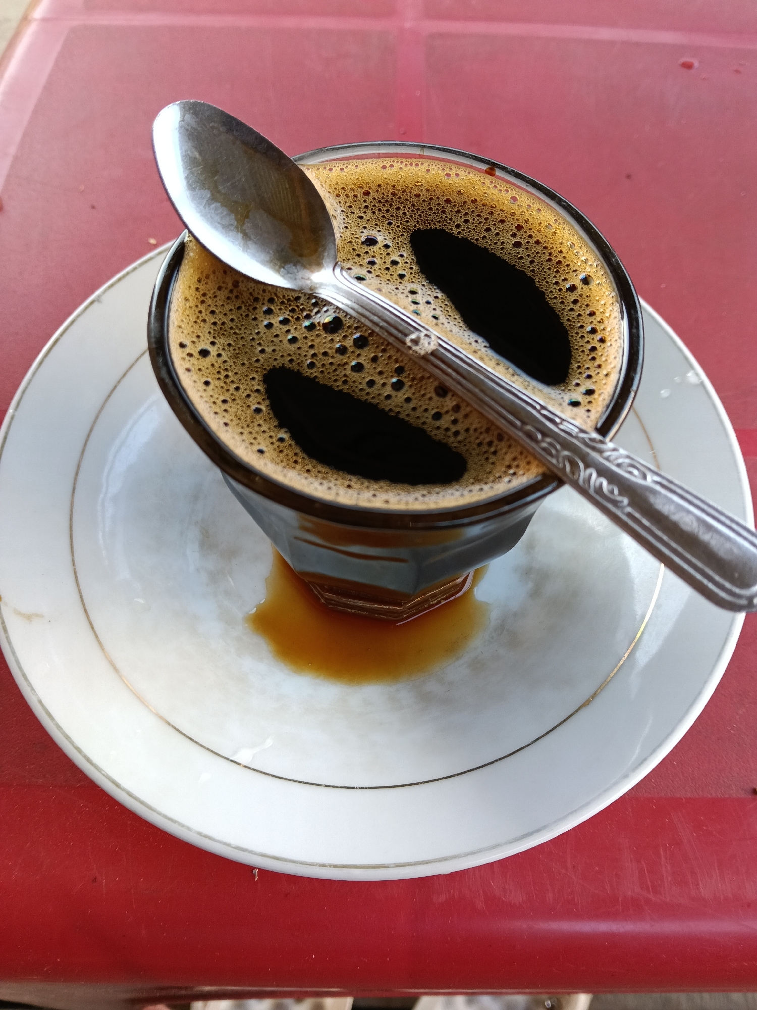 - "A high-angle, close-up photograph displays a glass of black coffee, topped with light brown foam exhibiting numerous small bubbles, placed on a white ceramic saucer with a thin gold rim" by FM-eKNBo1, licensed under CC BY 4.0