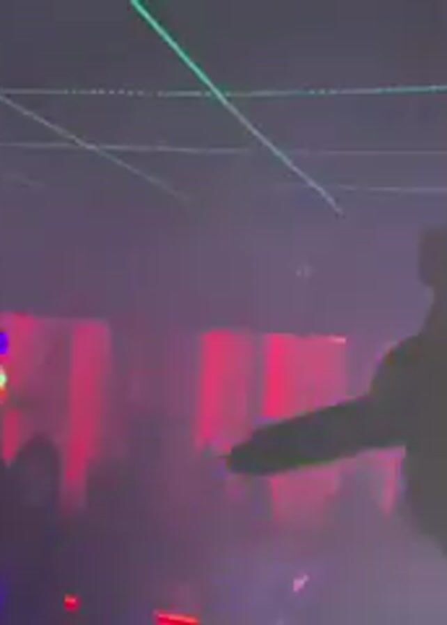 The video captures a crowded, smoky nightclub environment lit with pink, blue, and green laser lights