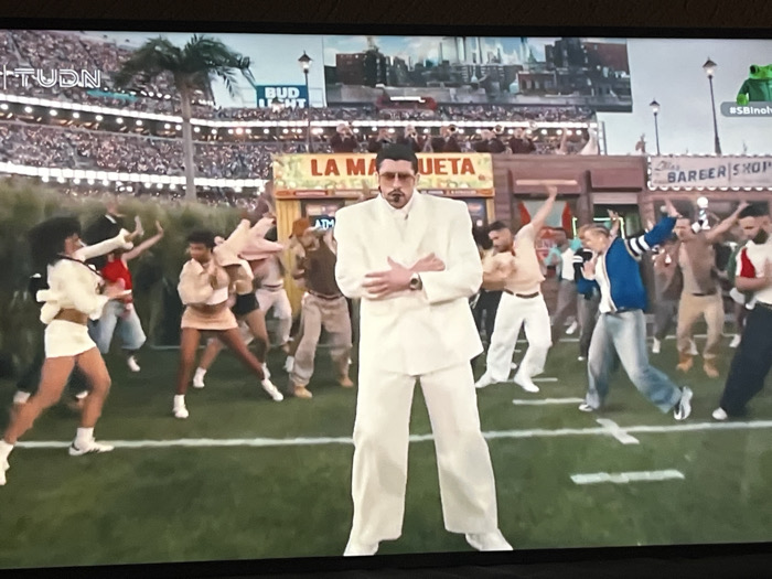 Bad Bunny stands prominently center stage in a white suit, arms crossed, amidst a lively performance setting. Dancers in various outfits surround him on what appears to be a football field. Faux buildings with signs like "La Maqueta" and "Barber Shop" create a backdrop reminiscent of a stylized neighborhood. Crowd-filled stands are visible in the distance, along with advertisements like "Bud Light". A green frog mascot sits atop a pole to the right, hashtagged with "#SBInolvidable". The entire scene appears to be a broadcast on the "TUDN" network.