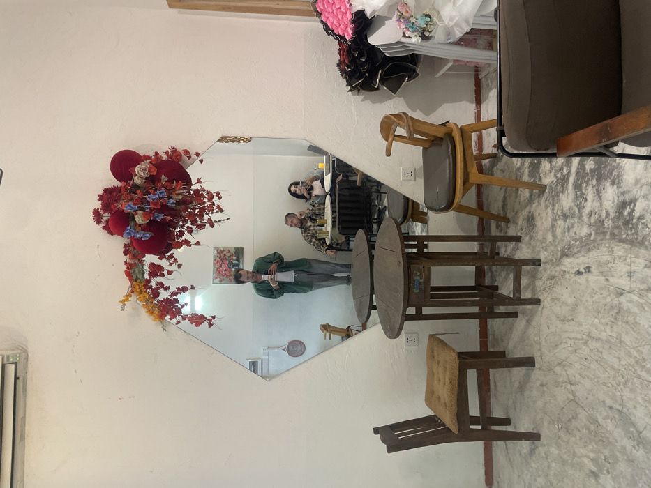 The scene depicts the interior of an establishment, stated to be located in Nha Trang, Vietnam, likely a cafe or a cafe within a flower shop. The environment features white textured walls and a light grey concrete floor with darker vein patterns. A large, irregular hexagonal mirror is centrally mounted on the upper wall, adorned at its top with an elaborate floral arrangement comprising prominent red spheres, trailing red foliage, and accents of blue and yellow flowers. An air conditioning unit is mounted high on the upper left wall. In the foreground, two dark wooden, round pedestal tables are positioned in the mid-left. The front table includes a small drawer. To the immediate left is a dark wooden chair with a light brown cushion, and to the right is a lighter wooden chair with a dark brown upholstered seat. The back of a dark brown armchair is visible in the lower right corner. A retail display to the far right showcases multiple bouquets of flowers, including pink and red roses, wrapped in black and white paper. Reflected in the mirror, three individuals are visible. A standing male, centrally reflected, faces the mirror while looking down at a white smartphone held in both hands. He wears a light green overshirt over a white undershirt and grey trousers. To his right, a seated male with a beard wears a plaid shirt and gazes towards the left. He is seated at a dark table with a glass containing a yellow beverage. Beside him, a seated female with dark hair looks towards the right while holding a light-colored smartphone. She wears a light-colored top, and a similar yellow beverage and a laptop are visible on the table in front of her. Further reflections include a small framed floral painting and a white racket hanging on a wall to the left within the mirror's view. Two electrical outlets are visible on the wall below the mirror.