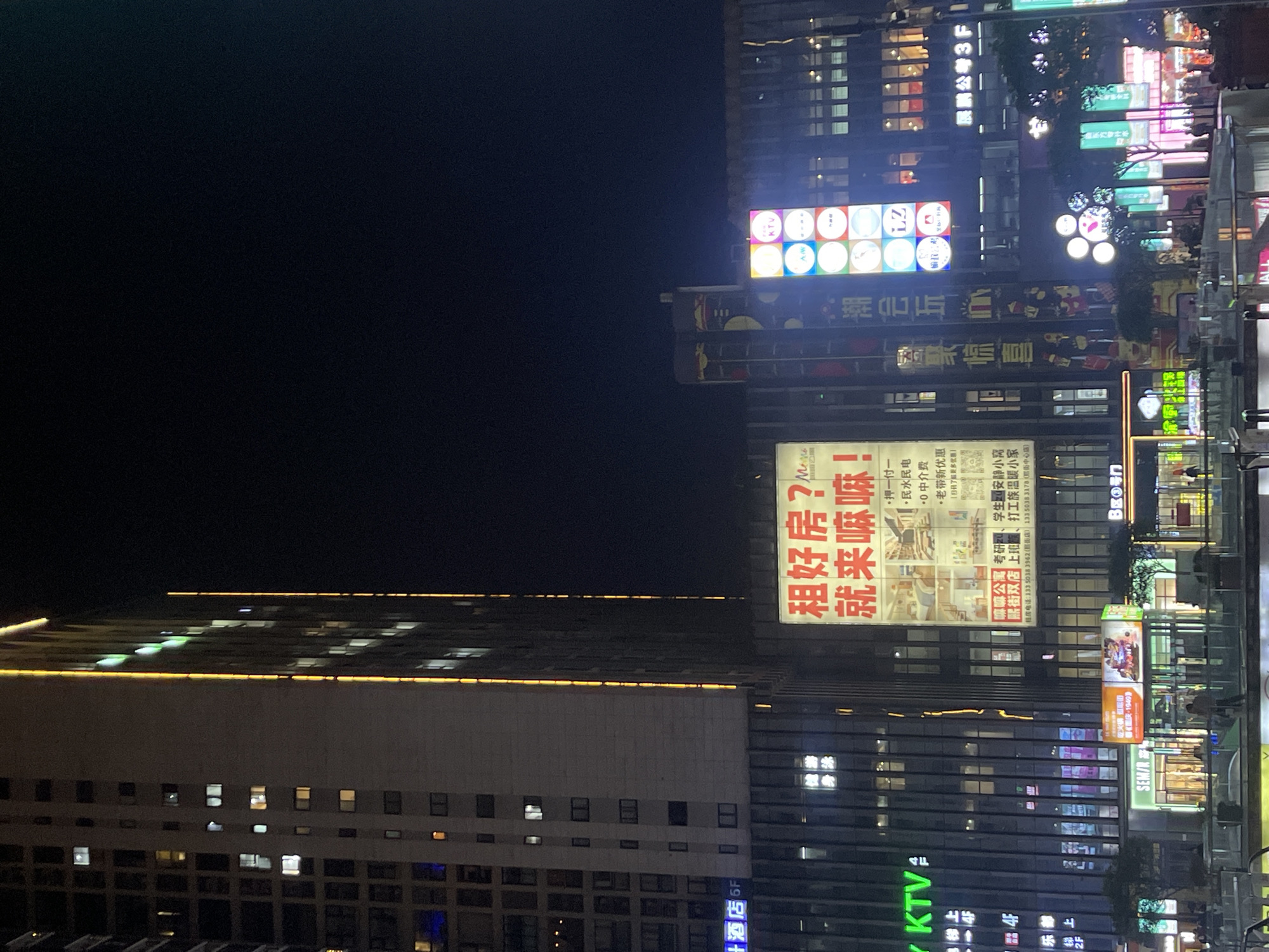 The image depicts an urban scene at night, likely taken in the Chongqing High-tech Zone, China, based on the Chinese characters and businesses visible. The focus is on buildings with numerous lighted windows, suggesting residential or commercial occupancy. Several brightly lit signs are visible, including advertisements for apartments ("租好房? 就来嘛嘛!", meaning "Looking for a good apartment? Come to Mama!") and businesses like KTV (karaoke), restaurants ("吃火锅红麻街," implying "Hotpot street"), and hotels. The signs feature Chinese and some English text. Some buildings exhibit modern architecture, indicative of a contemporary urban environment. The overall setting is typical of a densely populated area with active nightlife.