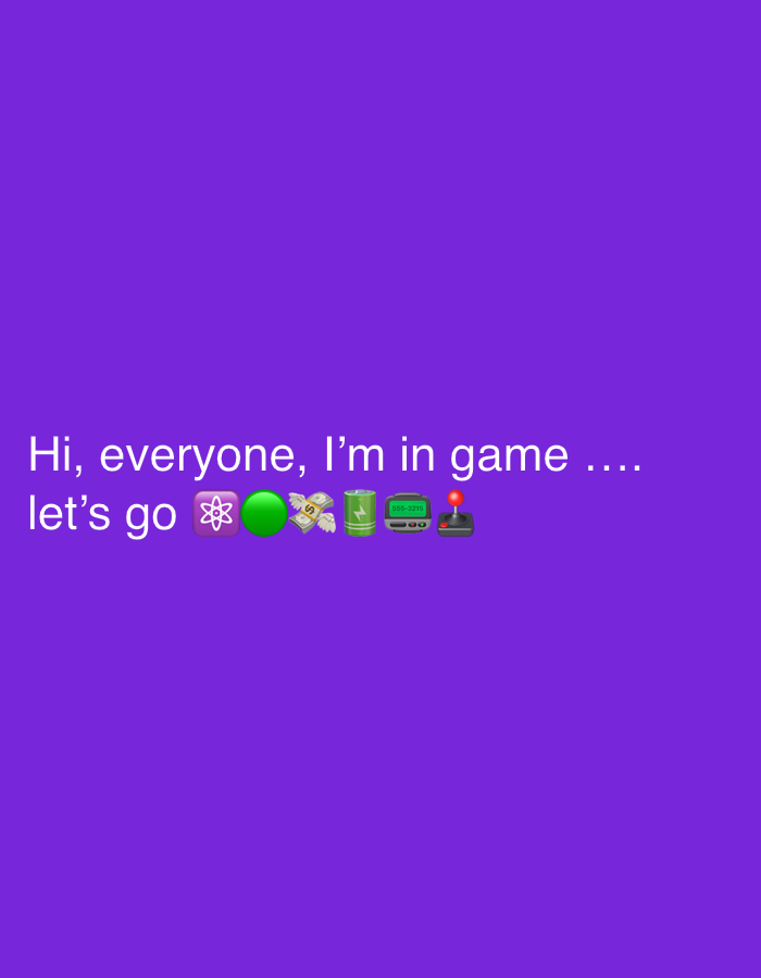 The image displays white text against a solid purple background. The text reads, "Hi, everyone, I'm in game ...." on the first line, followed by "let's go" on the second line. Below the second line of text, a sequence of six emojis is present: an atom symbol (âī¸), a solid green circle (đĸ), a stack of money with wings (đ¸), a green battery icon with a lightning bolt (đ), a digital device showing "555-3215" (đ), and a vintage-style joystick (đšī¸). No visual elements within the image provide information regarding a specific physical location in Tel Aviv, Israel, or any other geographical area. There are no people, explicit actions, or environmental details beyond the background color and text/emoji content.