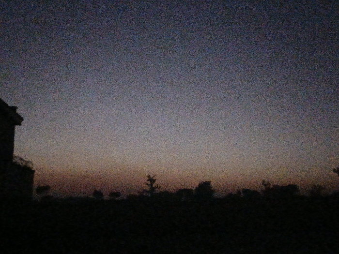 A twilight scene features a dark silhouette of trees and vegetation against a gradient sky. The sky transitions from a deep blue at the top to a lighter, orange-tinged horizon. A building, partially visible on the left, further emphasizes the darkness of the foreground. The overall image has a grainy texture, possibly due to low lighting conditions or high ISO setting.