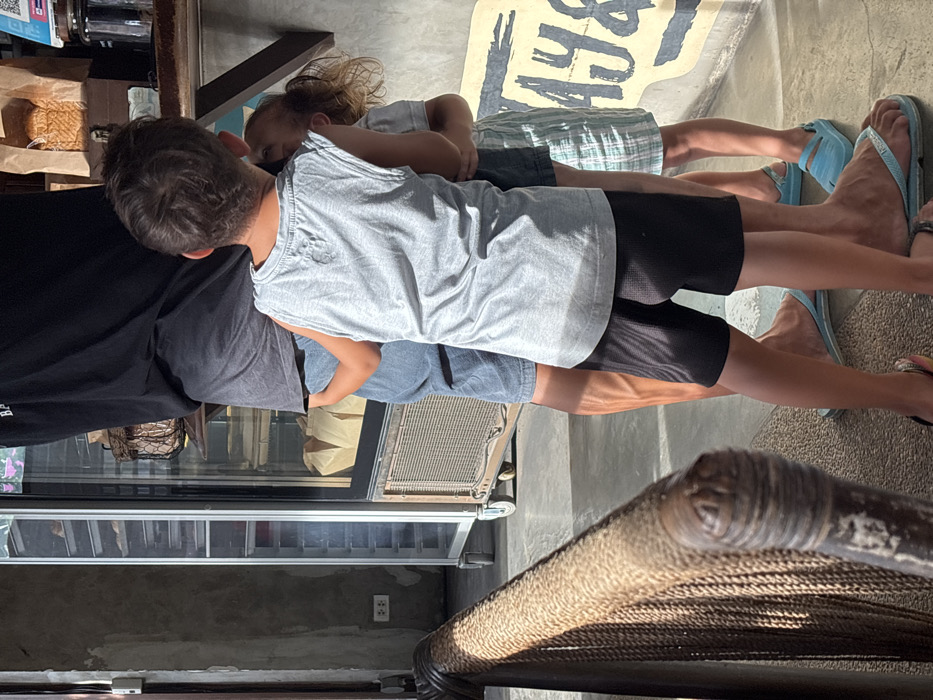 An indoor scene within a commercial establishment in General Luna, Philippines, is captured in bright daylight. Three individuals are visible: an adult male, seen from the waist down to the mid-calf, wearing a black t-shirt, blue shorts, and light blue flip-flops. In front of him, a child, approximately 5-7 years old, is seen from behind, wearing a grey sleeveless shirt and black athletic shorts, with black flip-flops. This child has their arms wrapped around the adult's midsection. Partially obscured behind this child, a second, smaller child, approximately 3-5 years old, is visible, wearing a light-colored vertically striped dress or shirt, and light blue clogs/sandals. This younger child is also positioned close to the adult. The background features a concrete wall on the left with two white electrical outlets. Adjacent to it stands a tall, silver-framed glass display refrigerator with multiple internal shelves, some empty, others containing items. To the right, another display unit with a wooden frame and glass front showcases items in brown paper bags, likely baked goods. Above this, a wooden shelf holds more items, including what appears to be woven baskets and a square QR code sticker. Further right on the wall, a partially visible white sign with dark text reads "AY&" followed by obscured characters. In the foreground on the left, a woven rattan or rope-textured railing runs horizontally. The concrete floor is visible, with strong sunlight casting distinct shadows.