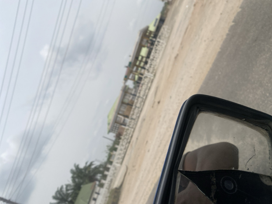 The image depicts a roadside scene in Owo, Nigeria, viewed from inside a vehicle. In the immediate foreground, the black-framed side mirror of the vehicle is visible, with a triangular section of its glass cracked or absent in the upper left corner. A reflection of a dark-skinned arm or shoulder is discernible within the remaining mirror surface. Beyond the vehicle, a paved road surface is visible in the lower right, transitioning to a wide, unpaved, light brown, and dusty ground area. In the left background, a structure with a green roof and white walls is partially obscured by palm trees and enclosed by a low, white decorative fence. In the right background, further down the road, a larger, multi-story building with a light green roof stands behind a similar white fence or wall. To its immediate right, another structure, consistent with a fuel pump canopy, also featuring a light green roof, is visible. The sky is overcast with grey clouds, and multiple overhead utility lines traverse the upper portion of the frame. No individuals or specific actions are discernible.