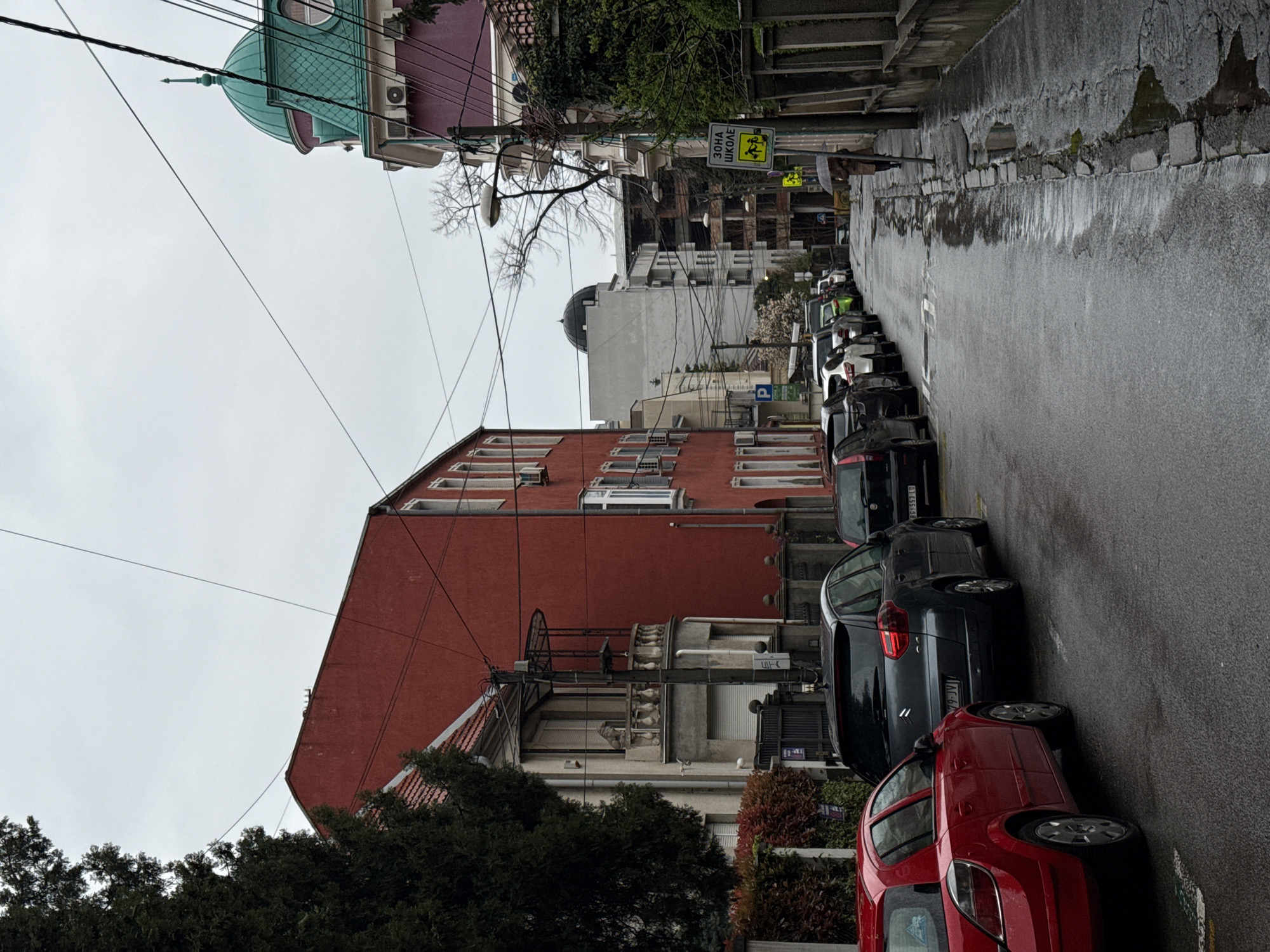 The image depicts a street in Belgrade, Serbia, notable for its dense urban character and varied architectural styles. The street itself is lined with parked cars on the right side, a typical feature of city streets. The road surface appears wet, suggesting recent rain. The buildings along the street exhibit a mix of designs and colors. A prominent red building with multiple windows and air conditioning units is visible. At the top of the image, a building with a distinctive green dome is present. Overhead, numerous utility wires crisscross the sky. A street sign indicates a school zone, with the Cyrillic inscription “ЗОНА ШКОЛЕ.” A figure is walking in the distance.