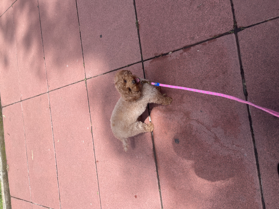 - "A small, light-brown or apricot-colored poodle-type dog is standing on a paved outdoor surface under direct sunlight" by FM-lAJLT2, licensed under CC BY 4.0