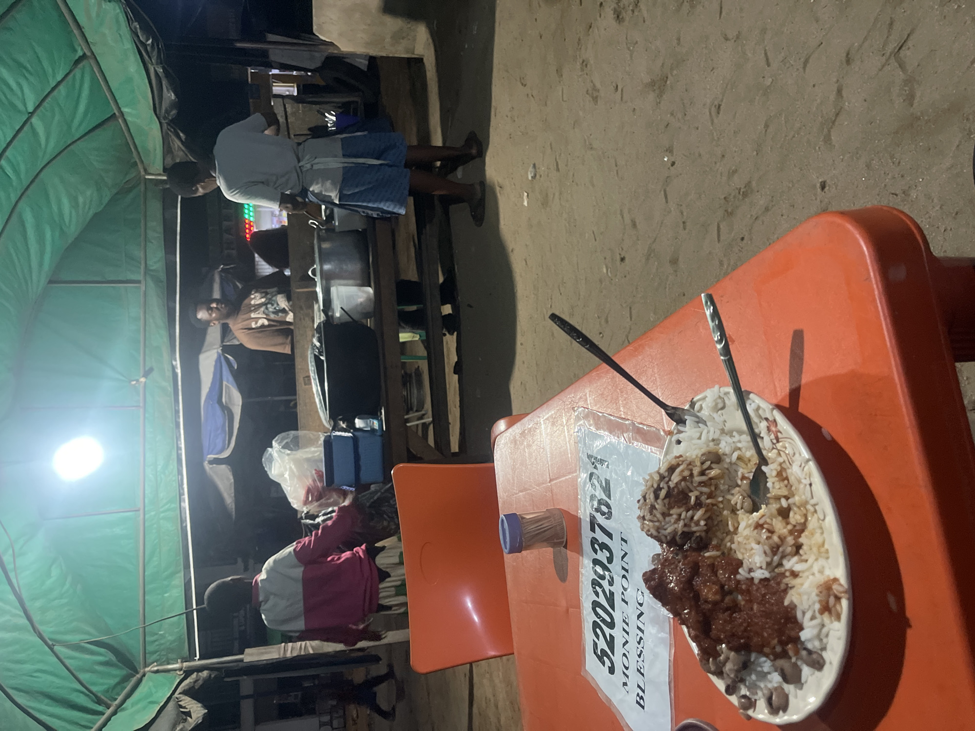 The image depicts a nighttime scene at what appears to be a roadside food stall in Abraka, Nigeria