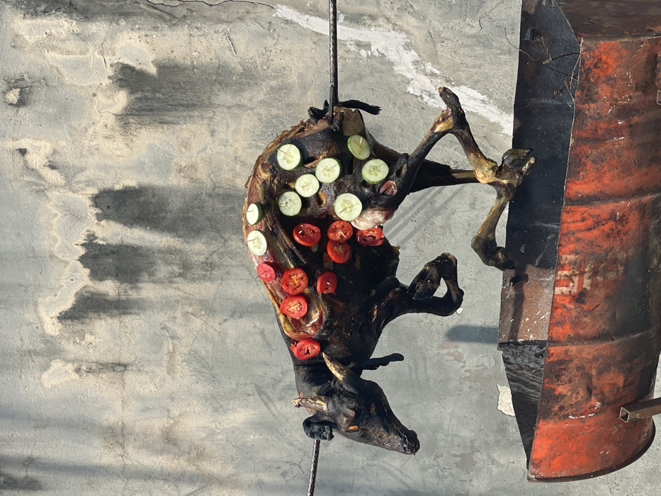 A whole roasted animal, likely a goat or small lamb, hangs suspended horizontally on a metal spit over a makeshift barbecue pit