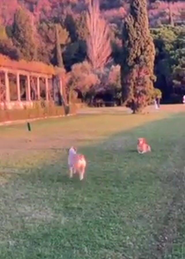 Two dogs are in a grassy area near a structure with columns. One dog, light brown and white, is standing, and the other dog, brown, is lying down. The grassy area is surrounded by trees and a mountain in the background. The lighting suggests it is late afternoon or early morning. The setting seems to be a well-maintained park or garden. There are people in the distance, but they are small and indistinct. The standing dog appears to be looking at the lying dog.