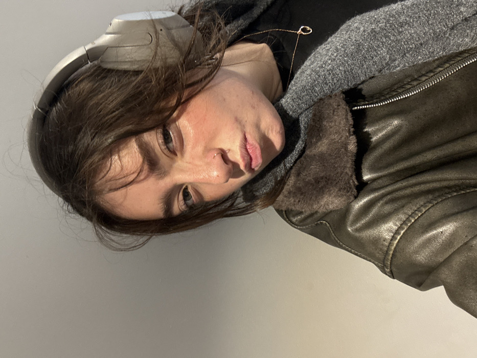A female individual is depicted in an indoor, close-up portrait, facing forward with a slight head tilt and pursed lips. She has medium-dark brown hair, fair skin with a flushed appearance on her cheeks, and light-colored eyes. A silver stud piercing is visible on her right nostril. She wears large, light grey over-ear headphones. Her attire consists of a dark, distressed-look leather jacket featuring a dark brown faux fur collar, a grey knitted scarf, and a black top. A thin gold-colored chain necklace with a small, irregular pendant rests on her chest. The background is a plain, light-colored wall. The scene is situated within the city of Hull, United Kingdom.