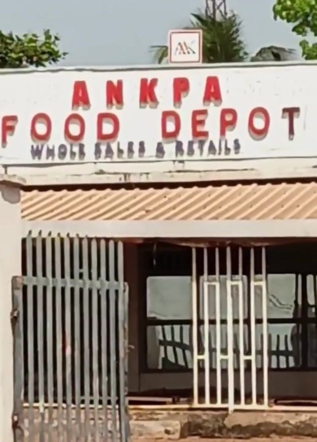 daytime view of a building with the sign "ANKPA FOOD DEPOT WHOLE SALES & RETAILS" in red lettering above the storefront. The building has a white facade, and a corrugated metal roof. A security gate is slightly ajar at the building's entrance. The ground in front of the building is dirt. The video moves slightly, panning to the right, before stopping. There is some vegetation to the left and right sides of the building. A communications tower can be seen in the background.