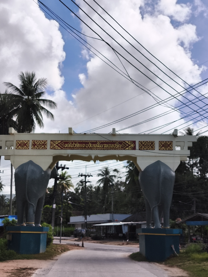 A white archway adorned with golden patterns spans a road, featuring elephant statues on each side. The road leads towards buildings nestled among palm trees and lush greenery. Overhead, the sky is a mix of blue and puffy white clouds, intersected by a network of power lines. The image captures a scene of cultural architecture harmonizing with a tropical landscape.