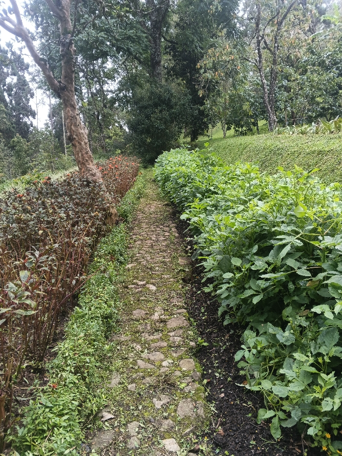 The image displays a narrow, winding, unpaved path composed of irregular stones, partially obscured by moss and small green vegetation, in an outdoor setting within Tây Ninh, Vietnam. The path extends from the lower center of the frame towards the upper center. To the immediate left, a dense border of shrubbery, characterized by reddish-brown stems and dark green leaves, lines the path. Behind this border, a single tree with a textured, light brown trunk is visible, followed by a dense stand of various broadleaf and coniferous trees. To the immediate right of the path, a continuous bank of uniform green, leafy plants forms a boundary. Beyond these plants, a gently rising slope covered in low-lying green vegetation is present, culminating in additional mature trees in the distance. The scene is illuminated by ambient daylight, suggesting an overcast sky or significant tree cover. No human figures, animals, or artificial objects are present within the frame.