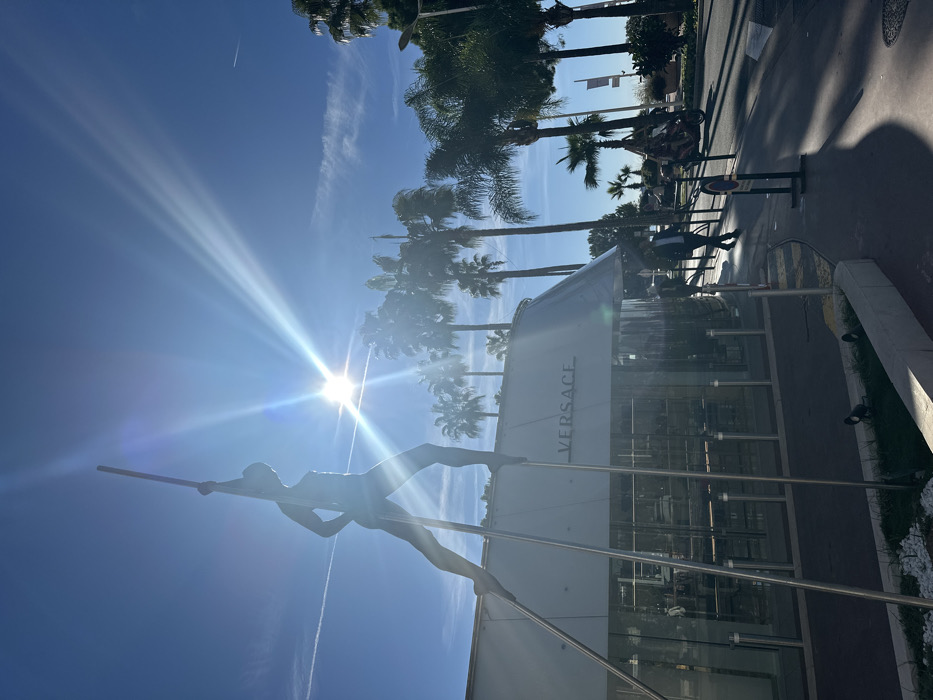 The image displays a sunlit street scene in Cannes, France, specifically featuring the Versace boutique likely situated on the Boulevard de la Croisette. In the foreground, a tall, dark-silhouetted sculpture of a human figure stands on two prominent metallic stilts, holding a long pole vertically in its right hand. Behind this sculpture, a modern, curvilinear building with a glass facade houses the "VERSACE" luxury store, its name clearly visible on the white overhead structure. The bright sun, positioned in the upper left quadrant, emits a strong starburst flare across a clear blue sky, which contains visible contrails and sparse clouds. To the right of the building, a paved pedestrian area borders a street lined with numerous tall palm trees. A pedestrian in dark clothing is visible walking on the sidewalk. Further down the street, a scooter or motorcycle is present. The environment indicates a high-end commercial area under clear daytime conditions.