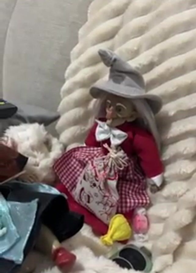 doll of an old witch in a red dress with white hair and a gray pointed hat. Another doll of a witch, with long red hair and a blue hat and dress, sits next to her. Both are on a light-colored, fluffy blanket. In the background, a person in pink pajamas is decorating a white Christmas tree with lights and ornaments. A remote control is near the witch doll with the blue hat. The video appears to be taken indoors, in a home setting.