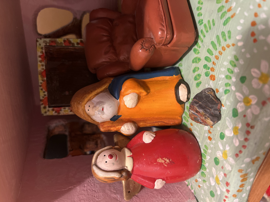 This image depicts a miniature interior scene, identified as being in the city of Bar, Montenegro. The scene features two ceramic or clay figurines positioned on a light green surface decorated with a pattern of white daisy-like flowers with yellow centers and green leaves. On the left, a figurine, approximately 7 inches tall, is dressed in a red gown with a white collar and small golden wings on its back. It has a round red nose, small black eyes, and light brown hair. Some surface wear is visible on the red gown. To its right, a second figurine, approximately 8 inches tall, is depicted as an older figure wearing an orange hooded robe and a blue cloak. It possesses a prominent nose, small black eyes, and a white beard or chin area. This figurine holds a brown staff vertically in its right hand. Between the figurines and extending towards the front, a small, irregularly shaped rock, multi-colored with hues of dark grey, brown, and reddish-orange, rests on the patterned floor. In the background, on the right, a miniature reddish-brown upholstered armchair is visible. Behind the figurines, the back wall is light pink. An irregular, dark opening framed by a rough, brick-like texture is visible in the back wall on the left. To its right, a dark, rectangular object with a colorful, patterned frame (featuring orange and yellow elements) hangs on the back wall. The left wall of the scene is also pink.