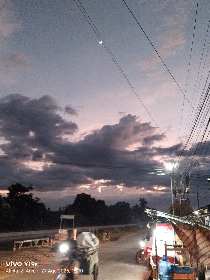 This image captures a roadside scene at dusk in Kertajaya, Indonesia, timestamped 18:10 on August 27, 2025. The sky is characterized by extensive, dark gray cumuliform clouds, with lighter purplish-pink hues visible towards the horizon, indicating sunset. A slender, illuminated crescent moon is visible in the upper left quadrant of the sky. Numerous overhead power lines crisscross the upper right portion of the frame, leading to a utility pole. The foreground features an asphalt road curving gently. On the left side, dark silhouettes of trees and dense foliage form the background. Closer to the road on the left, a low-lying, light-colored structure, possibly a bench or barrier, is dimly visible, illuminated by a vehicle's headlight. Behind it, a light-colored, open-framed structure is also present. On the right side of the road, a street lamp mounted on a utility pole is brightly illuminated. Directly beneath this lamp is a roadside vendor stall, identifiable by its red frame, a partially visible striped awning, and multiple large blue plastic water cooler bottles displayed for sale. A red motorcycle, with its headlight on, is stationary or parked adjacent to this stall. A blurred motorcycle, its headlight brightly illuminated, occupies the center of the road, appearing to move towards the viewer. A large, light-colored, possibly covered object or package is secured to the rear of this motorcycle. The rider is indistinct due to motion blur and low light conditions. Further down the road on the left, another faint light source suggests the presence of an additional vehicle.
