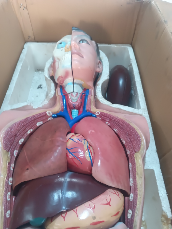 - "An anatomical human torso and head model is depicted resting inside a brown cardboard box, secured by white styrofoam packaging, located in Warri South, Nigeria" by FM-KuKCT2, licensed under CC BY 4.0