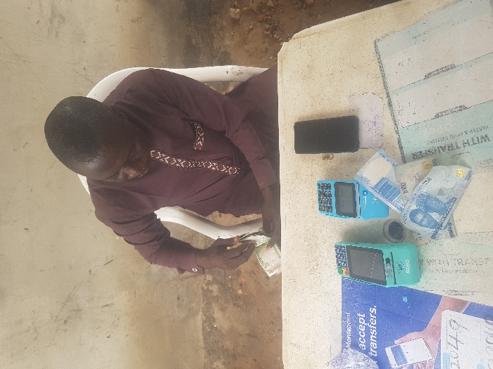 The scene depicts a financial transaction environment in the city of Atlanta, United States. A dark-skinned adult male, wearing a maroon long-sleeved tunic with patterned embroidery, is seated on a white plastic chair. He is observed from an elevated perspective, looking downward and actively handling a stack of currency notes with both hands. On the light-colored table in front of him, two electronic point-of-sale (POS) terminals (one teal, one light blue), a black smartphone, and several scattered Nigerian Naira banknotes, including visible 1000 Naira denominations, are present. A partial "Moniepoint accept transfers" sign is also visible on the table's surface. The immediate background consists of a plain, light-colored wall, and the ground below the table appears to be a rough concrete surface.