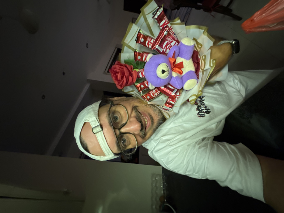 This image depicts an indoor residential setting in Pecatu, Indonesia. An adult male with a light complexion, stubble beard, and short dark hair visible beneath a backward-worn white baseball cap is centered in the frame. He wears dark-framed glasses and a white short-sleeved shirt with a dark graphic design on the left chest. He is smiling and looking directly at the camera, holding a gift bouquet in his right hand. The bouquet consists of a small purple teddy bear with a red bow tie, surrounded by approximately eight to ten individually wrapped Kit Kat chocolate bars. A single artificial red rose is positioned at the top center of the arrangement. The entire bouquet is wrapped in white paper with gold-colored trim. The background shows a dimly lit interior space with light-colored walls and a ceiling featuring recessed lighting. A dark, indistinct surface, possibly furniture, is partially visible on the left side, and a red plastic bag is partially visible on the floor in the bottom right corner of the frame.