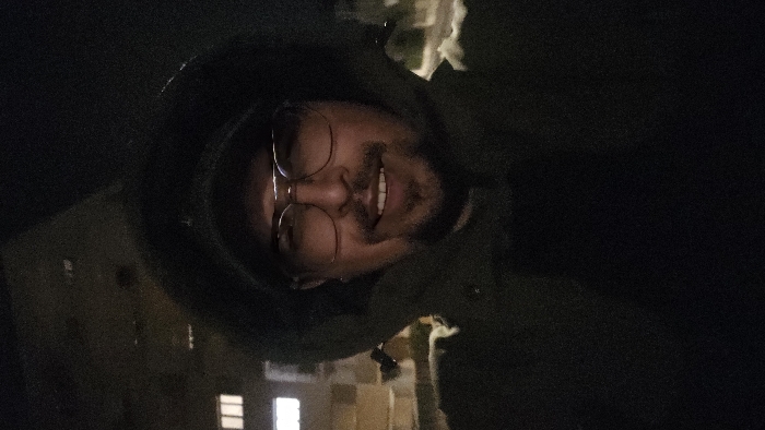 A person with glasses and a beard smiles into the camera while wearing a hooded jacket. The lighting is dim, revealing the subject's face and upper body. The background appears to show a building with illuminated windows. The person's hood is up, suggesting a cold environment.