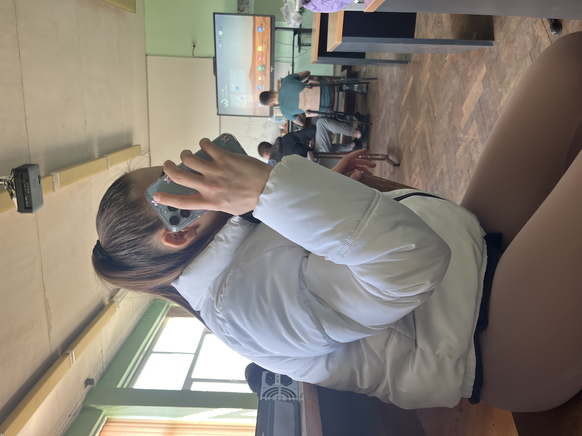 A medium shot shows a woman inside a room, possibly a classroom in Cherven Bryag, Bulgaria, engaged in a phone call. She is holding a smartphone decorated with small pink flowers to her ear, her head tilted toward the phone. She is wearing a puffy white jacket and tan leggings, sitting on a wooden desk. In the background, two male figures are seated facing a whiteboard with handwritten notes and a digital screen that shows icons. One of the figures is wearing a green shirt. The flooring of the room is wooden, and windows are visible on the left side, suggesting the scene is occurring during the day. A black projector hangs from the ceiling.
