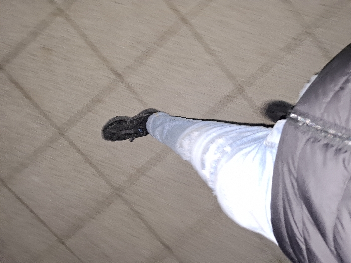 A first-person, downward-facing view depicts the lower torso, right leg, and foot of an individual