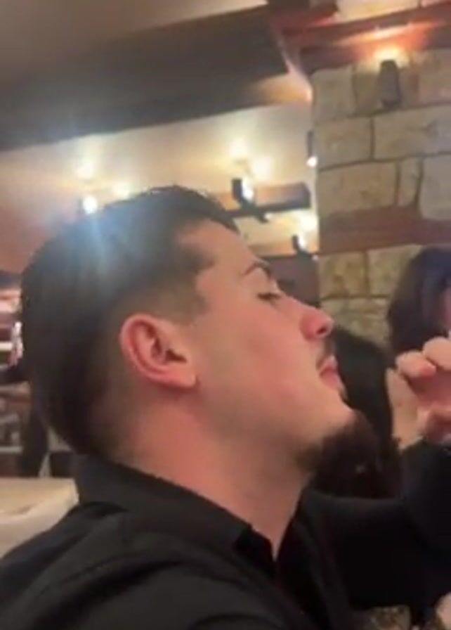 A man with a mustache wearing a black button-down shirt moves his hands while listening to music. He is inside a restaurant with stone walls and wood beams. Other people are present in the background.