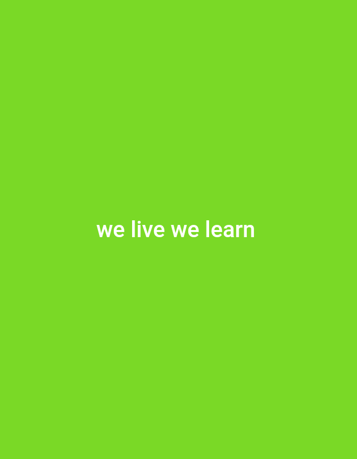The image displays white text reading "we live we learn" centrally positioned against a solid lime green background