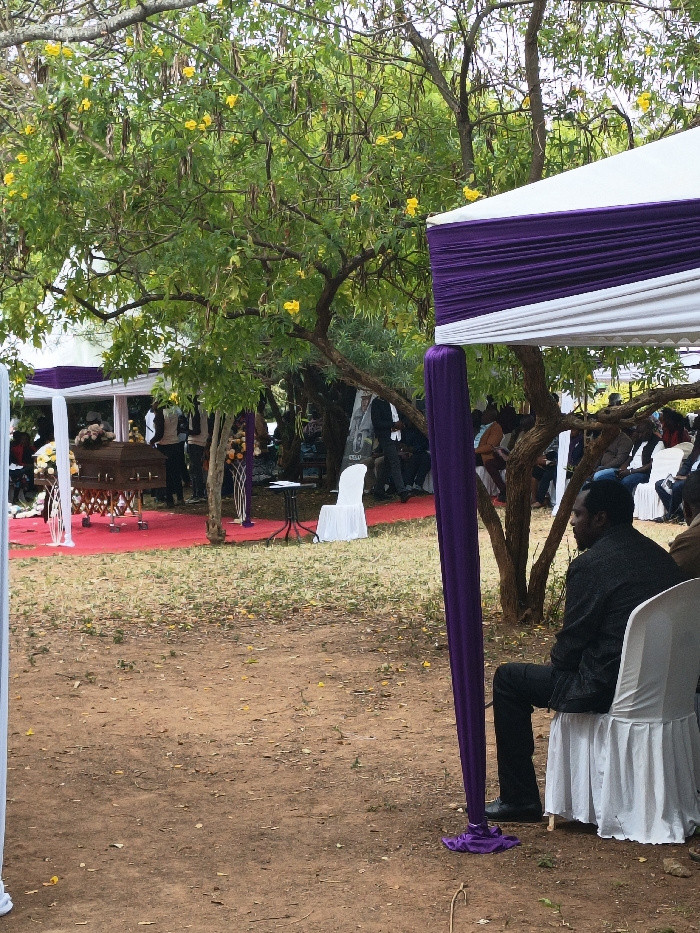 An outdoor funeral scene unfolds beneath trees with yellow flowers and long seed pods. A dark-stained coffin rests on a red carpet. White and purple draped tents shade seated attendees. A man in a dark shirt and black pants sits on a white chair in the foreground. A white chair and a small table sit on the carpet near the coffin. The ground is covered in dry grass and bare dirt.