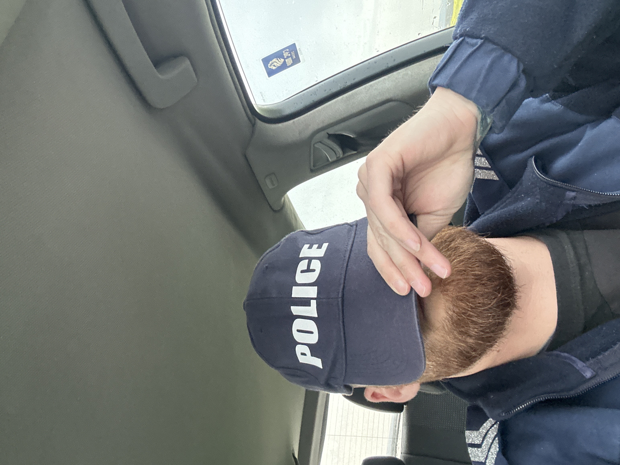 A man wearing a dark blue "POLICE" cap is in the driver's seat of a vehicle