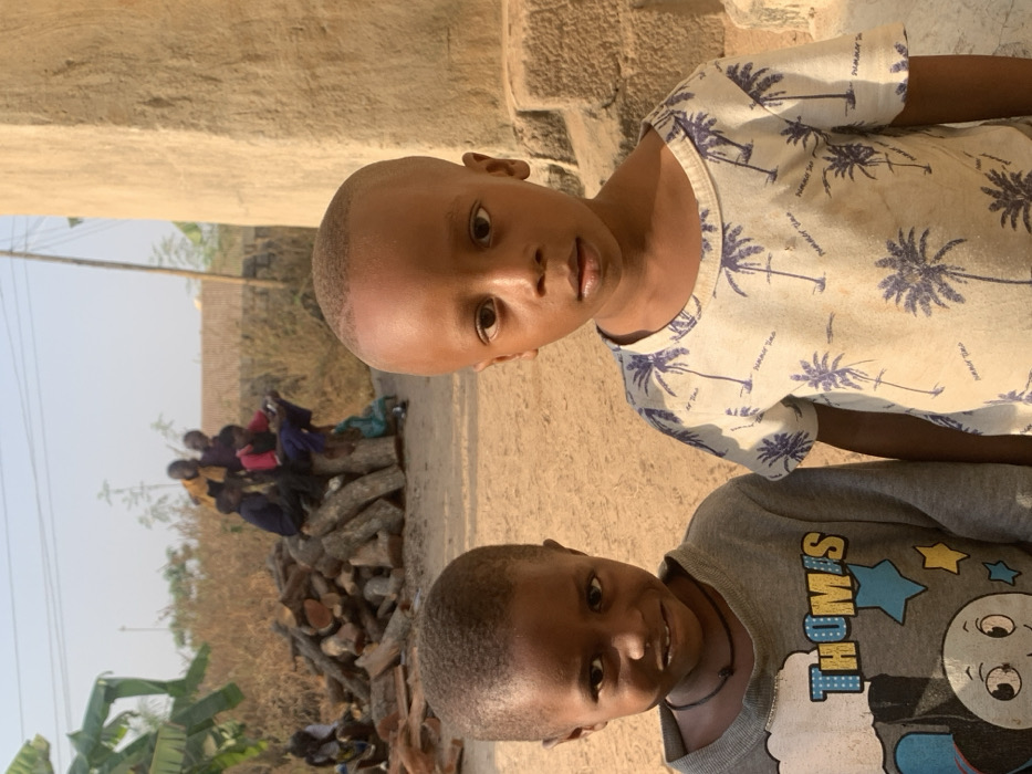 The image depicts an outdoor scene in Garaku, Nigeria, featuring two young Black males in the foreground