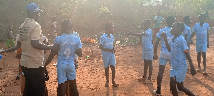 The image depicts an outdoor scene in Konongo, Democratic Republic of the Congo, featuring a group of individuals on reddish-brown dirt ground. In the foreground, one adult male, dressed in a light brown polo shirt, dark trousers, and a blue baseball cap, stands with his back partially to the viewer, facing right. His left arm is extended forward, holding a blue object, possibly a deflated ball. Text is visible on the back of his shirt. He interacts with a group of approximately eight to ten children, primarily boys, who are dressed in light blue soccer-style uniforms consisting of short-sleeved shirts and matching shorts. Several shirts display "ETIHAD" branding, and one child's back shows "HAALAND" above the number "9." The children are positioned in various stances across the mid-ground, some looking towards the adult, others looking in different directions. One child in the mid-right points his right arm towards the right side of the frame. In the background, the terrain rises gently, covered with dense green foliage and sparse trees. Scattered debris, including plastic bags, is visible on the ground in the mid-ground. Other figures are present in the background, including a person in yellow seated on the elevated ground and another person in green standing further back. The scene is illuminated by natural light, casting a slightly hazy appearance.