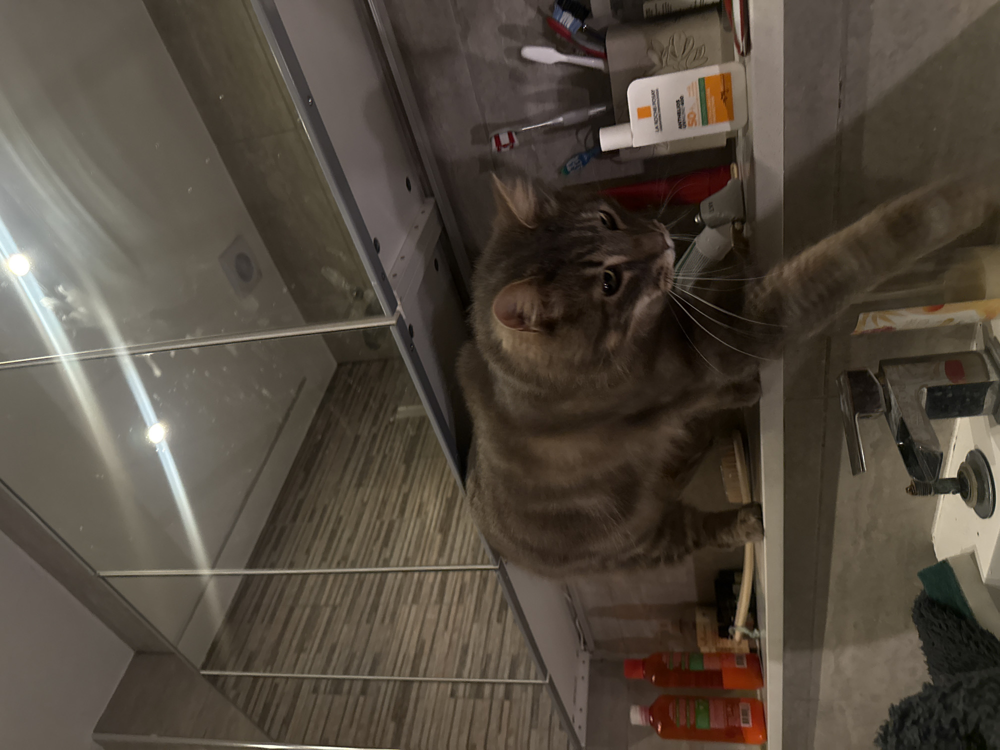 A gray tabby cat is perched inside an open bathroom cabinet. The cat faces the bathroom sink, its right paw extended towards the faucet. Various bathroom items, including toothbrushes, a La Roche-Posay sunscreen tube, and bottles, are visible on the shelf in the cabinet. The bathroom cabinet has a mirrored door. The sink is white with a silver faucet. The background shows a vertically lined wall or door and a light fixture reflected in the mirrored door. The location is unknown.