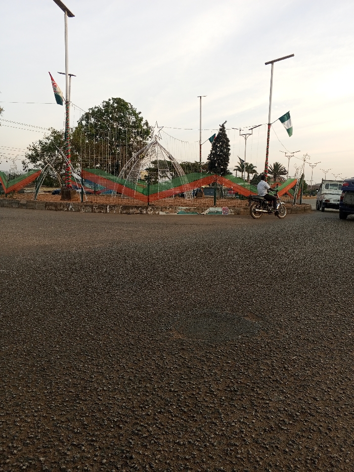 A traffic circle is decorated with festive lights, including a star-topped structure. The perimeter is adorned with red and green streamers. Flags are displayed on nearby poles. A person rides a motorcycle across the circle, and two vehicles are parked on the far side. The foreground is dominated by a textured asphalt road under a lightly clouded sky.