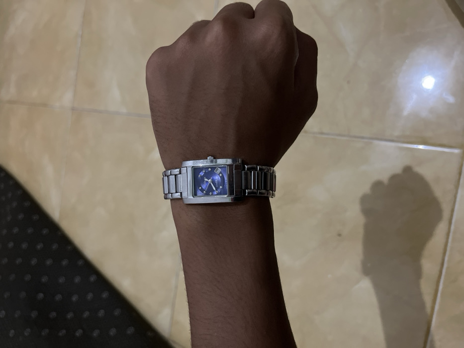 A medium-dark skinned arm is depicted from the forearm to a clenched fist, positioned over light-colored tiled flooring. A silver-toned, rectangular metal wristwatch with a link bracelet is worn on the left wrist. The watch features a dark blue dial with three circular luminous markers at the 3, 6, and 9 o'clock positions, and a triangular luminous marker at the 12 o'clock position. A date window at the 3 o'clock position displays the number "18". A crown is visible on the right side of the watch case. The arm is angled with the forearm extending from the upper left, and the clenched fist is positioned towards the lower right. A distinct shadow of the fist is cast on the tiles to the lower left. A dark, patterned fabric or surface is partially visible in the upper left background. The scene is located in Pulorayeuk, Indonesia.