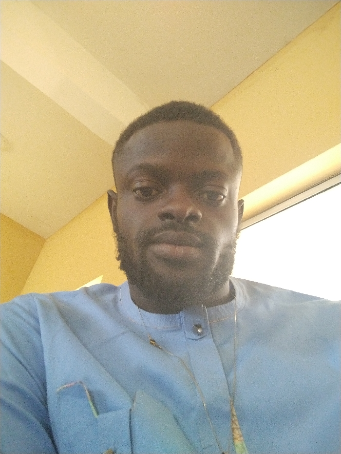 The image displays a close-up portrait of an adult male. The individual has dark skin, short dark hair with a faded style, and a full dark beard and mustache. He is wearing a light blue, long-sleeved garment with a band collar secured by a single silver-colored button. A thin, golden-colored chain necklace with a dark, ornate pendant is visible around his neck and resting on his chest. A decorative or embroidered element, featuring small patches of green and orange thread, is present on the upper left chest area of his attire. His gaze is directed forward, meeting the camera lens, with a neutral facial expression. The background appears to be an indoor setting with a light cream or pale yellow wall or ceiling, exhibiting diagonal architectural lines in the upper left. A bright white area, consistent with a window or significant light source, is visible in the upper right background. The specific city of Wumat, Nigeria, cannot be confirmed from the visual evidence within the image.