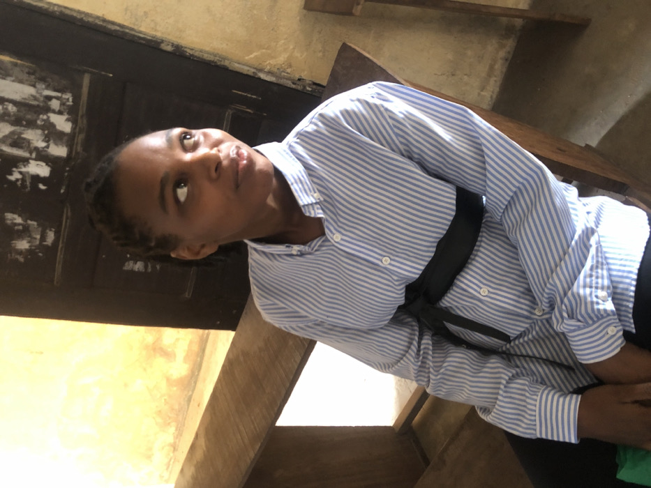 A young adult female is depicted seated indoors in Orji, Nigeria. The individual, with dark skin and dark braided hair, is positioned from the mid-chest upwards, looking towards the upper right with a neutral expression. She is wearing a long-sleeved button-down shirt with light blue and white vertical stripes, and a black fabric strap or belt is cinched around her waist over the shirt. She is seated on a light brown wooden bench or pew, which extends across the mid-ground. The background features a light yellow-tan wall to the left, showing textural variations and illumination suggesting natural light. To the right, a dark brown wooden door with a weathered appearance is partially visible. A small green fabric item is visible at the lower left edge of the frame.