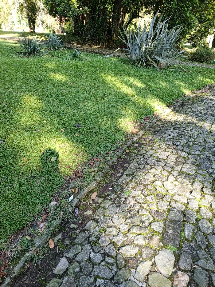A stone-paved path edges a vibrant green lawn dotted with shrubs. Sunlight streams through the trees, casting shadows across both surfaces. The grass appears thick and lush, contrasting with the moss-covered stones of the path. Leaves and small debris scatter along the boundary where the grass meets the stone. The shadow of a person can be seen in the lower left corner.