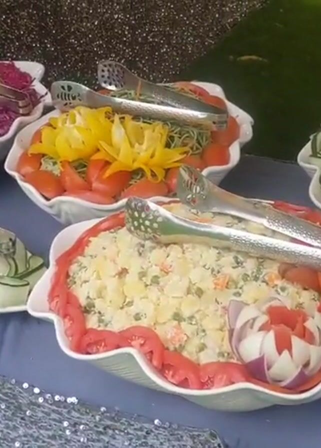 The camera pans across a table filled with five ornately presented bowls of salads. The bowls are arranged on a blue table cloth that's covered with a layer of sparkling fabric. The salads vary in color and composition, featuring ingredients such as shredded cabbage, sliced tomatoes, cucumbers, and what appears to be potato salad. Each bowl is equipped with a pair of metal tongs. In the background, a person in a red and dark patterned dress can be partially seen. A lawn is visible behind the person. To the left of the salad bowls is a covered serving dish.