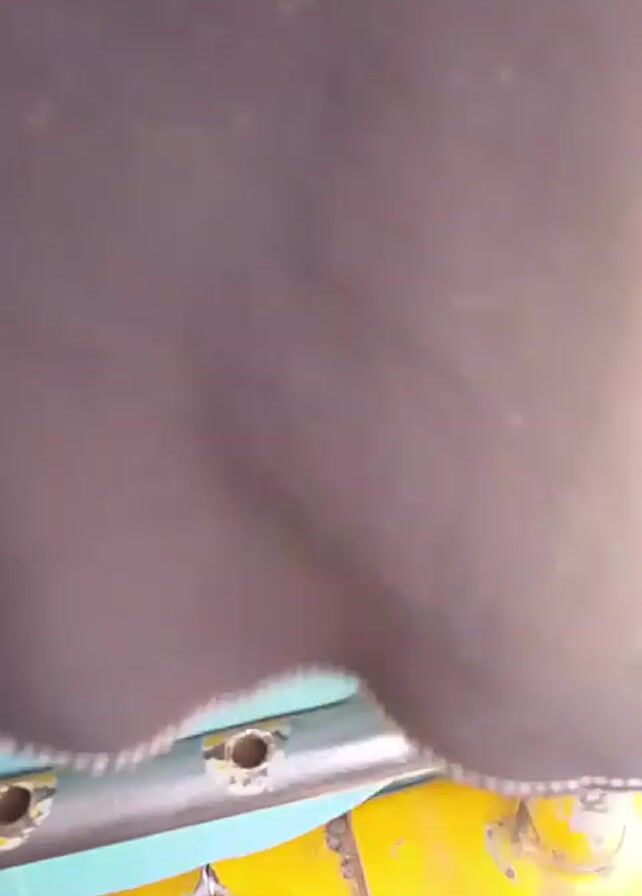 The video begins with a close-up view of a dark fabric, edged with a white border, obscuring the view. Beneath the fabric, one can discern elements of a vehicle: a section of a light blue surface and a yellow component, possibly the frame or chassis. As the video progresses, the camera is pointed upwards, revealing an obscured view of the sky. The footage appears to be taken from inside a vehicle or under a cover.