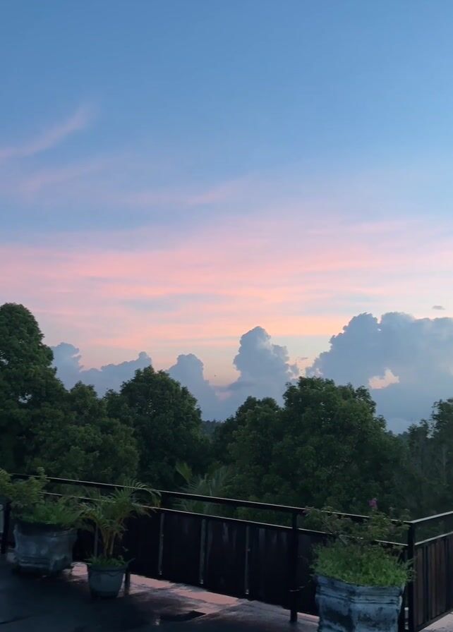 view from a balcony overlooking a landscape with lush green trees under a beautiful sky. The sky is a blend of soft pastel colors, transitioning from a light blue at the top to shades of pink and orange near the horizon. There are fluffy, white clouds scattered across the sky, some tinged with the colors of the sunset. The balcony has a dark metal railing, with several potted plants situated along its edge. The floor of the balcony appears to be wet. The camera pans slightly, shifting the angle of the view but maintaining focus on the sky and landscape.