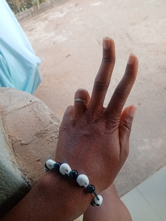 A dark-skinned human left hand is positioned centrally, with the index and middle fingers extended upwards to form a "V" shape. A thin, double-banded metallic ring is worn on the ring finger. A bracelet featuring alternating black spherical beads and white skull-shaped beads is present on the wrist. To the left, a light-colored, textured concrete or stone surface is visible. In the upper left background, a light blue fabric or material is partially visible, while the remainder of the background consists of a light tan, textured ground surface. The scene is located in Rido, Nigeria.