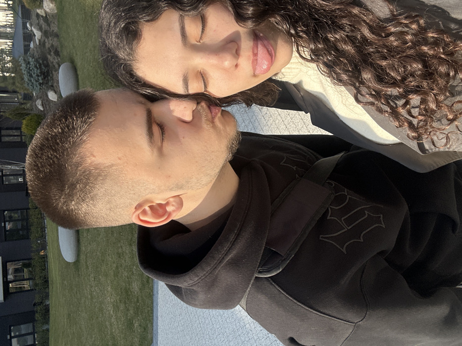 Two individuals, a male and a female, are depicted outdoors in a modern residential or mixed-use development within Sofia, Bulgaria. The male, positioned on the left, possesses short brown hair and light facial stubble. He is attired in a black hooded sweatshirt featuring a dark, stylized graphic print on the front and a black shoulder bag with a padded strap. He leans towards the female with puckered lips, appearing to attempt a kiss on her right temple or cheek area, with his eyes partially closed. The female, on the right, has long, curly dark brown hair. She is dressed in a light-colored turtleneck sweater under a dark open jacket. Her eyes are closed, and her tongue is extended slightly, indicating a playful expression. The background consists of a manicured lawn containing several light grey, rounded decorative rocks and small evergreen shrubs. Behind the landscaping, modern multi-story buildings with dark paneling and large windows are visible. The subjects are standing on a light-colored, textured paved surface. The scene is brightly illuminated by direct sunlight.