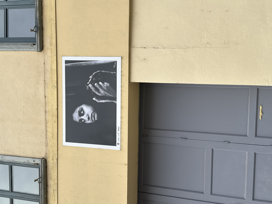 An exterior detail shot captures a segment of a building facade in Le Puy-en-Velay, France. The primary wall surface is a light yellow-cream stucco, showing minor discoloration and fine vertical cracks. At the top, two rectangular windows with dark grey-blue frames are visible; the right window is slightly open, revealing an internal metal latch, while the left is closed. Centrally positioned on the facade, between the windows and above a large entryway, is a rectangular black and white photographic print. The print depicts a young person, gender indeterminate but appearing feminine, shown from the chest up, with a direct gaze towards the left. Both hands are holding and operating a film camera. The photograph's background is uniformly dark. The white border of the print displays several small logos on the bottom left and a visible signature, "Henri Cartier-Bresson," on the bottom right. Below the poster, a substantial double-leaf door, painted in a uniform grey-blue, occupies the lower portion of the image. The door is paneled with recessed rectangular sections and features visible metal hinges along its central vertical seam. A small, horizontally oriented, gold-colored fixture is attached to the lower right panel of the door. The ambient light indicates an overcast sky.